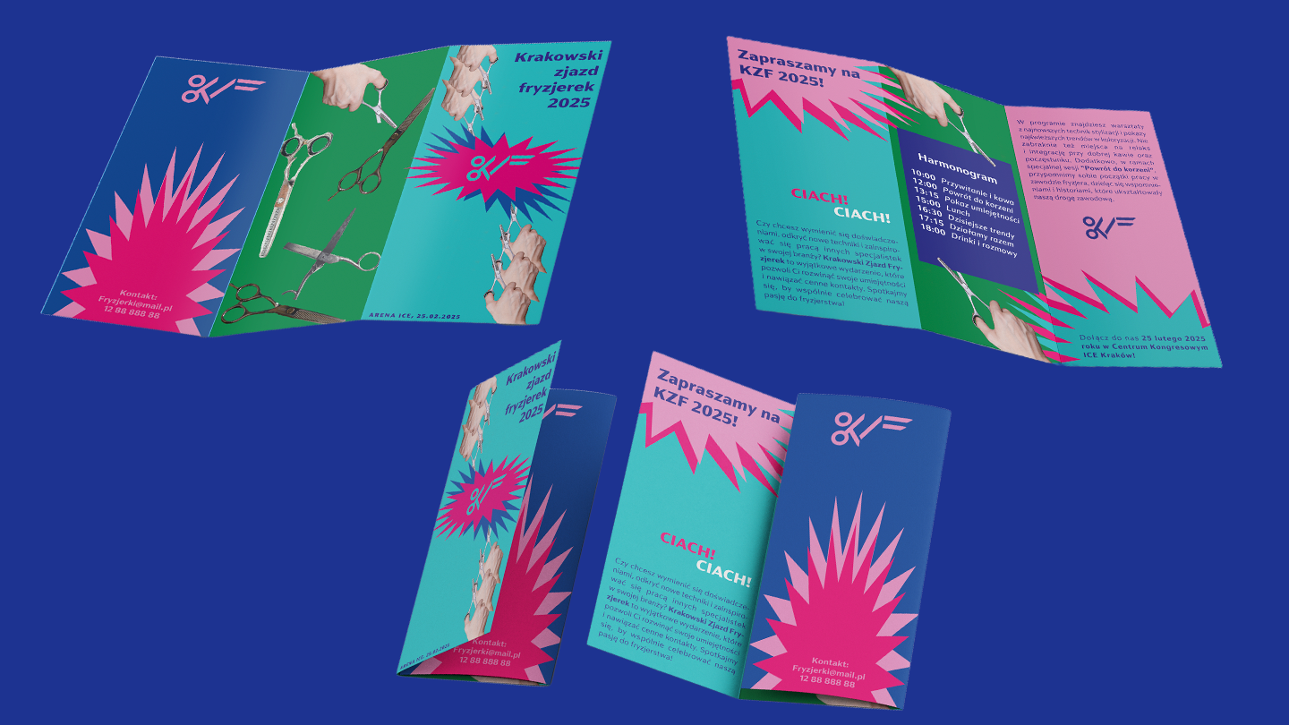 Logo is constructed from simplified letters K,Z,F wich are the shortening of the event name Krakowski Zjazd Fryzjerek. Letter K is morphed witch symbol of scissors. We wanted our logotype to be sharp and energetic for it to embody the spirit of that event.
